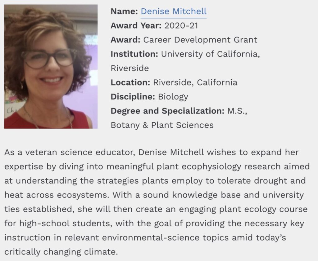 UPDATE NEWS FROM Denise: I am continuing to teach virtually my Chemistry classes. Thankfully, there are many resources online for virtual labs, although it doesn’t quite equal the “in classroom” experience in my opinion. I did drop my contract to 60% to open up some time for me to devote to my research and my courses. This decreases my student load from 175 to 105. I am so grateful to AAUW for the Career Development Grant because teaching on 60 % salary, and being head of household with a mortgage, does not allow for the finances to cover my tuition. In fact, the grant nearly pays for my entire second year!